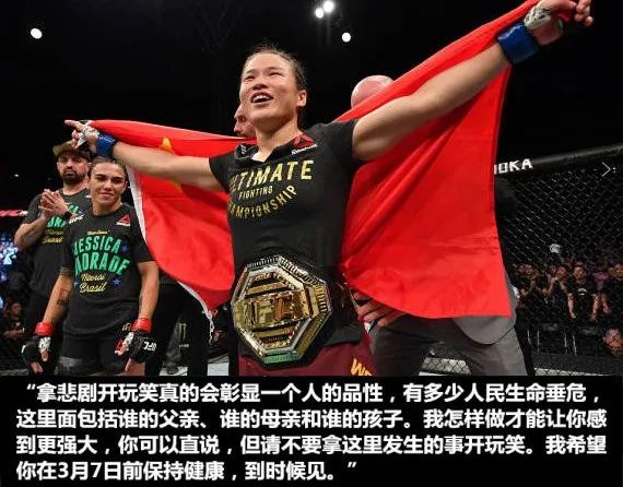 对手嘲讽疫情的自信脸vs被170拳K.O后的脸夺冠后,张伟丽才说:「其实我也不知道能不能拿下这场比赛我拼尽全力去赢下比赛,赢得比赛我非常高兴,在这个八角笼里所有人都值得尊敬,我不希望在八角笼里说垃圾话。我觉得在这个平台上都是武者,都需要相互尊重,需要给孩子们做一个好的榜样,所以我觉得我们是冠军,我们不是暴君。」