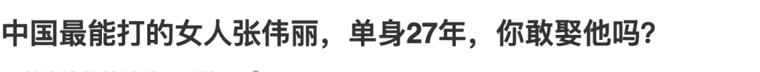 在妇女节这一天,这样一场胜利,让所有人,看见了中国女性的力量。09但是我们也悲哀的发现,仍然有一些人,对于女性有着不可理喻的刻板印象,甚至说是偏见。张伟丽夺冠后,有媒体号迅速发了这样的内容:「看看历年张伟丽的KO集锦,不知道这样的女孩以后会嫁给谁…」👇