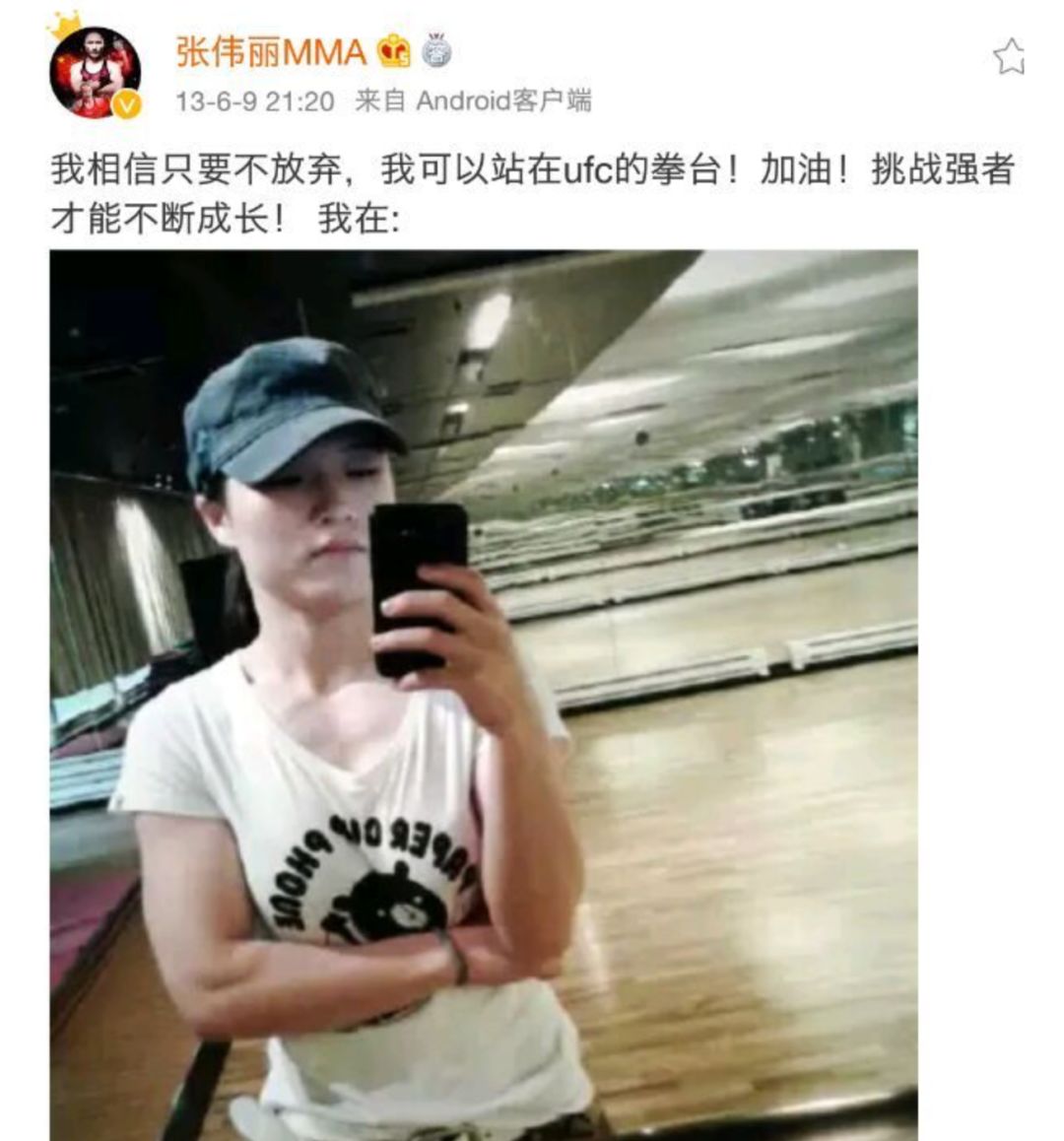 052013年,一场UFC比赛彻底点燃了张伟丽的梦想。那是格斗巨星Ronda Rousey在第一场女子UFC比赛中,击败Liz Carmouche。Ronda的动作干净漂亮,有一种说不出的,专属于女子格斗的「暴力美」。张伟丽深深着迷了:原来女生可以这么漂亮,这么帅!看完那场比赛后,她回味了很久,在自己在微博上写了一句话,「只要我不放弃,总有一天,我会站在UFC的擂台上。」