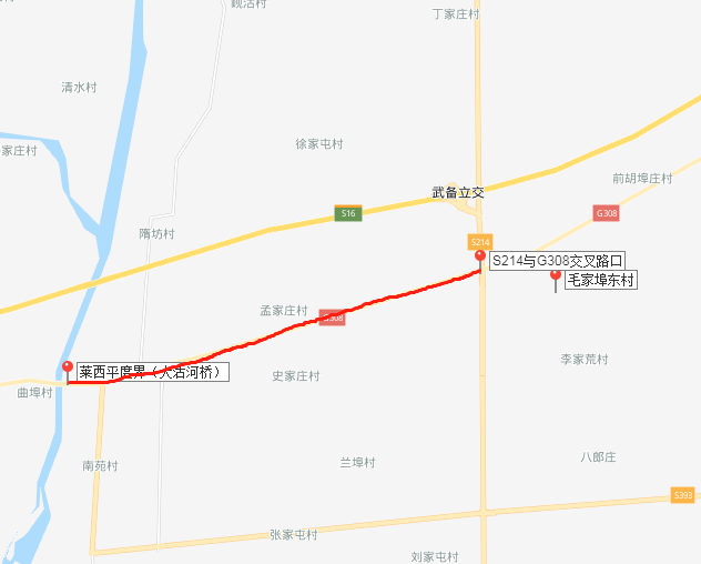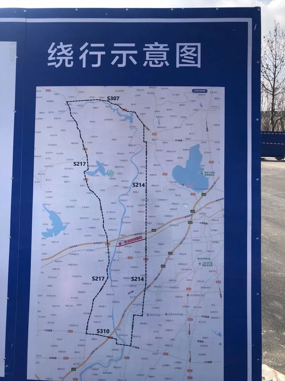 根据最新绕行示意图,目前第一阶段封闭路线如下图,即【S214(上海西路尽头北)与G308交叉路口—莱西平度交界处(大沽河桥)】