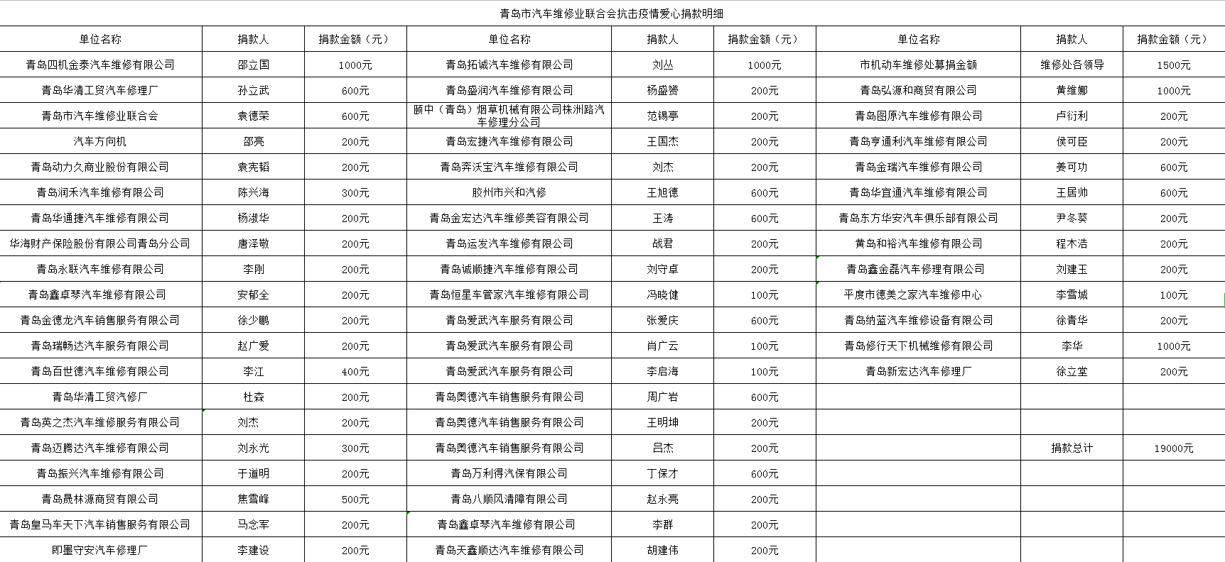 不仅如此,在青岛市汽车维修业联合会党支部的带动下,联合会所有会员单位举办了公益募捐活动,青岛爱武汽车服务有限公司、青岛拓诚汽车服务有限公司、青岛四机金泰汽车维修有限公司、青岛修行天下机械维修有限公司、青岛弘源和商贸有限公司等联合会骨干企业纷纷伸出援助之手,积极参加到这次抗疫募捐活动中。