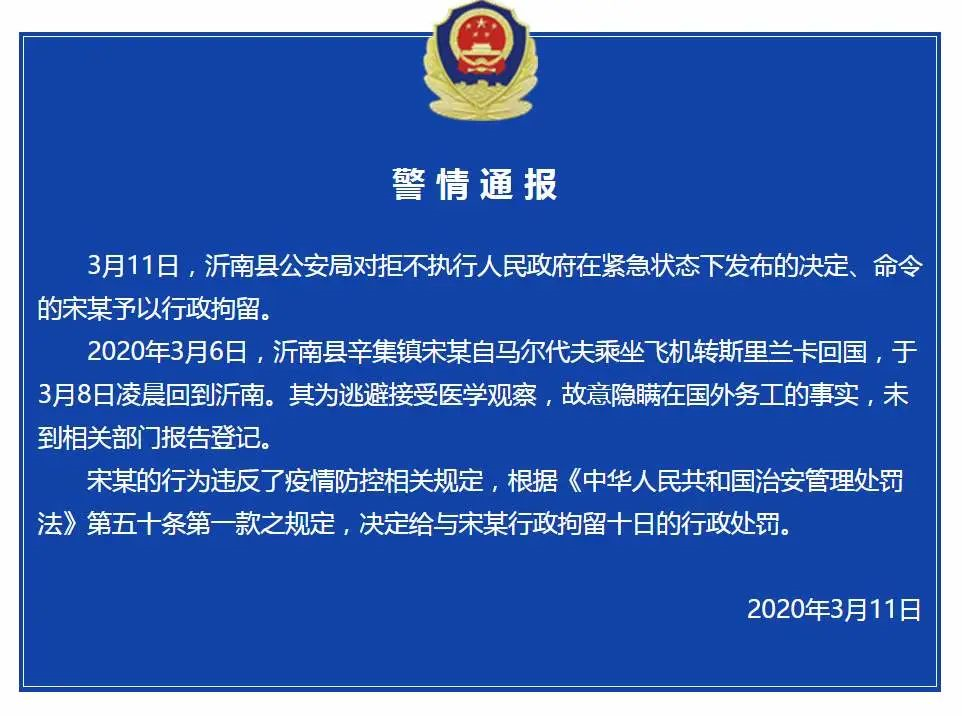 3月11日,沂南县公安局对拒不执行人民政府在紧急状态下发布的决定、命令的宋某予以行政拘留。