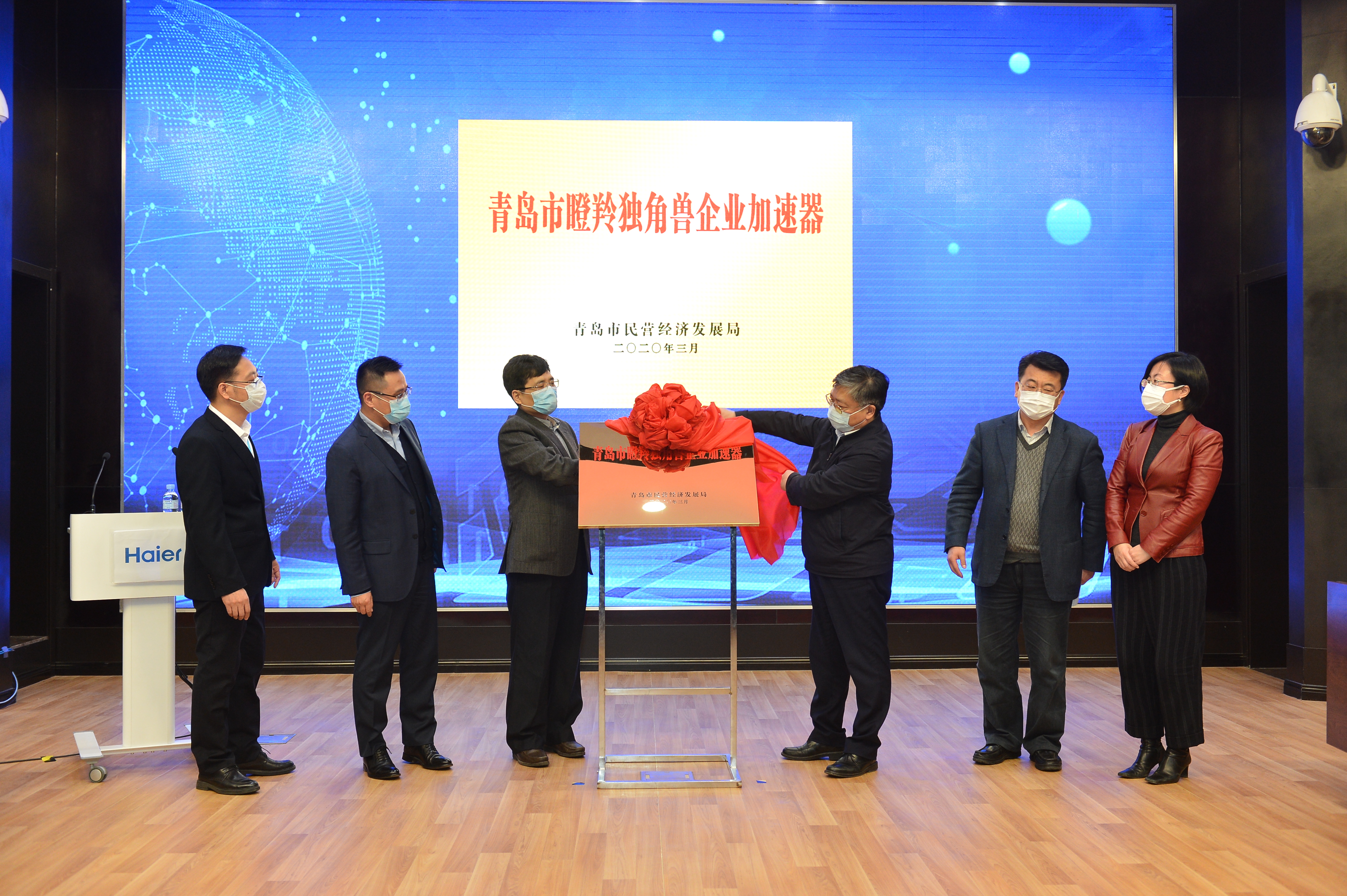 副市长耿涛,海尔集团总裁周云杰共同为青岛市首家瞪羚独角兽企业加速器揭牌。