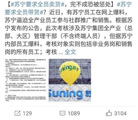 2月27日,苏宁部分员工在社交平台上爆料,苏宁逼迫全产业员工参与社群推广和销售,也就是所谓的“全员营销”,一时间引起了热议。