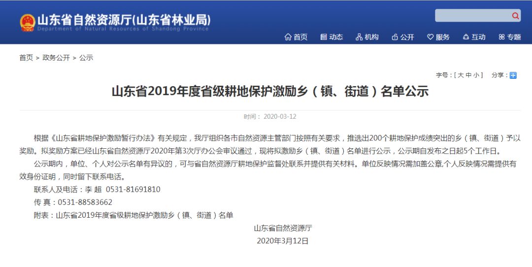 根据《山东省耕地保护激励暂行办法》有关规定,我厅组织各市自然资源主管部门按照有关要求,推选出200个耕地保护成绩突出的乡(镇、街道)予以奖励。拟奖励方案已经山东省自然资源厅2020年第3次厅办公会审议通过,现将拟激励乡(镇、街道)名单进行公示,公示期自发布之日起5个工作日。 公示期内,单位、个人对公示名单有异议的,可与省自然资源厅耕地保护监督处联系并提供有关材料。单位反映情况需加盖公章,个人反映情况需提供有效身份证明,同时留下联系电话。附表:山东省2019年度省级耕地保护激励乡(镇、街道)名单山东省2019年度省级耕地保护激励乡(镇、街道)名单党家街道(市中区);吴家堡(槐荫区);桑梓店街道(天桥区);张夏街道、孝里镇(长清区);回河镇、济阳街道、新市镇、太平街道(济阳区);安城镇、孝直镇(平阴县);许商街道、龙桑寺镇、郑路镇(商河县);方下镇、寨里镇、大王庄镇(莱芜区)。海青镇、宝山镇、琅琊镇(黄岛区);金口镇、段泊岚镇、田横镇(即墨区);仁兆镇、店子镇、崔家集镇、白沙河街道(平度市);河头店镇、马连庄镇、院上镇、沽河街道(莱西市);铺集镇、里岔镇(胶州市)。西河镇(淄川区);王村镇、萌水镇(周村区);皇城镇、朱台镇(临淄区);新城镇、荆家镇(桓台县);花沟镇(高青县)。西王庄镇(市中区);沙沟镇(薛城区);吴林街道(峄城区);张山子镇(台儿庄区);凫城镇(山亭区);西岗镇、木石镇(滕州市)。牛庄镇(东营区);新户镇(河口区);董集镇(垦利区);李鹊镇、丁庄街道(广饶县);凤凰城街道(利津县)。回里镇(福山区);王格庄镇、龙泉镇(牟平区);黄山馆镇(龙口市);冯格庄街道、谭格庄镇、沐浴店镇(莱阳市);郭家店镇、驿道镇、朱桥镇(莱州市);北沟镇(蓬莱市);苏家店镇、蛇窝泊镇(栖霞市);郭城镇、行村镇、辛安镇(海阳市)。于河街道(潍城区);黄旗堡街道(坊子区);朱里街道(寒亭区);王家庄街道(峡山区);邵庄镇(青州市);枳沟镇、石桥子镇(诸城市);化龙镇、田柳镇(寿光市);大盛镇(安丘市);柴沟镇(高密市);柳疃镇(昌邑市);山旺镇(临朐县);乔官镇(昌乐县)。喻屯镇、柳行街道(任城区);漕河镇(兖州区);尼山镇(曲阜市);圣水峪镇(泗水县);鱼城镇、王庙镇(鱼台县);霄云镇、羊山镇(金乡县);大张楼镇、马集镇(嘉祥县);次邱镇(汶上县);大路口乡(梁山县)。上高街道(泰山区);道朗镇、角峪镇、良庄镇(岱岳区);泉沟镇、天宝镇(新泰市);桃园镇、安驾庄镇、汶阳镇(肥城市);沙河站镇、接山镇(东平县);东疏镇(宁阳县)。温泉镇、初村镇(环翠区);界石镇、大水泊镇(文登区);俚岛镇、夏庄镇(荣成市);夏村镇、诸往镇(乳山市)。西湖镇、两城街道(东港区);高兴镇(岚山区);桑园镇(莒县);于里镇(五莲县)。李官镇(兰山区);罗西街道、沂堂镇(罗庄区);界湖街道(沂南县);李庄镇、花园乡(郯城县);夏蔚镇、崔家峪镇(沂水县);新兴镇(兰陵县);丰阳镇、柏林镇(平邑县);相沟镇、朱芦镇(莒南县);桃墟镇(蒙阴县);石门镇(临沭县)。黄河涯镇、抬头寺镇(德城区);辛店镇(禹城市);西段乡(乐陵市);兴隆镇(临邑县);王打卦镇、腰站镇(平原县);甲马营镇(武城县);尚堂镇(庆云县);杜集镇、刘营伍乡(宁津县);胡官屯镇(齐河县)。斗虎屯镇(东昌府区);胡屯镇、洪官屯镇(茌平县);尚店镇、大辛庄街道(临清市);尹集镇、清平镇、人和街道(高唐县);斜店乡、辛集镇(冠县);俎店镇、张鲁回族镇、观城镇(莘县);郭屯镇、寿张镇(阳谷县);刘集镇、陈集镇(东阿县)。滨北镇、秦皇台乡(滨城区);利国乡、下河乡(沾化区);明集镇(邹平市);石庙镇、大年陈镇、麻店镇(惠民县);流坡坞镇、商店镇、劳店镇(阳信县);碣石山镇、柳堡镇(无棣县);吕艺镇(博兴县)。普连集镇、青岗集镇、常乐集镇(曹县);彭楼镇、凤凰镇、富春乡(鄄城县);三春集镇、菜园集镇、小井镇(东明县);大黄集镇、李村镇(牡丹区);朱集镇、时楼镇(单县);龙堌镇、麒麟镇(巨野县);李集镇、唐庙镇(郓城县);大田集镇、党集镇(成武县)、孟海镇(定陶区)。有你家乡吗?