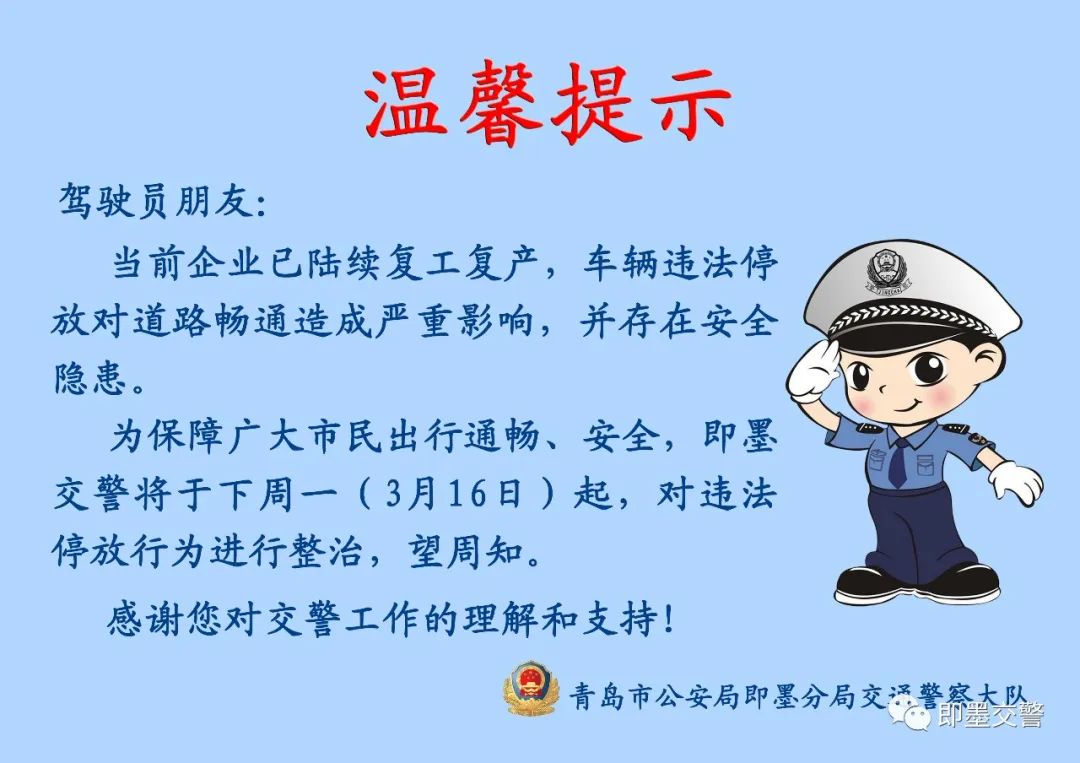 这张“温馨提示单”提醒广大驾驶员朋友:“当前企业已陆续复工复产,车辆违法停放对道路畅通造成严重影响,并存在安全隐患。为保障广大市民出行通畅、安全,即墨交警将于下周一(3月16日)对违法停放行为进行整治,望周知。感谢您对交警工作的理解和支持!”