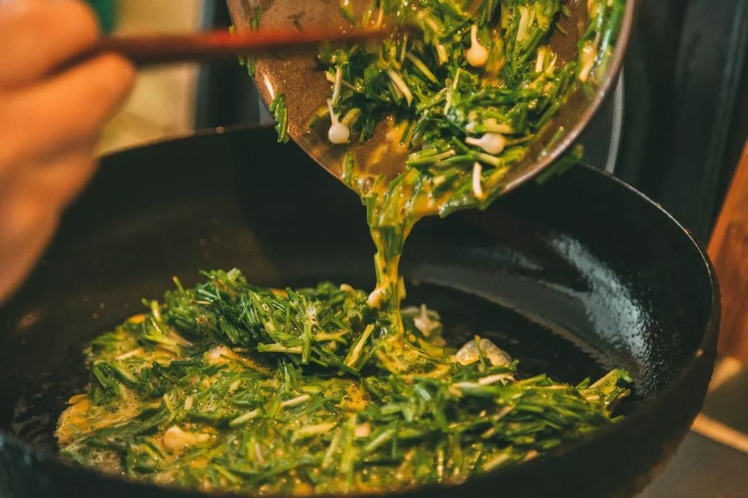 作为时令养生野菜中不可或缺的一个,新鲜山蒜切碎后打入蛋液,辅以调料,煎成的蛋饼将山蒜的鲜香与蛋的软嫩融合的相得益彰,尝上一口,简直鲜得要掉眉毛了!