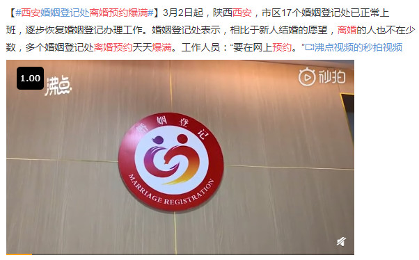 其实,想要等疫情结束后马上离婚的,不止她一个。3月2日,西安市17个婚姻登记处正式复工,自3日开始,多个登记处离婚预约就天天爆满,西安市雁塔区民政局婚姻登处已经排到了18号。上海闵行区离婚预约登记已经排队到4月15日。