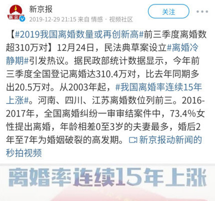 这让我想到年前征集意见,现已经提交全国人大常委会的民法典草案中“离婚冷静期”设置。不知道他们是不是要赶在民法典过会之前,不然婚可能很难离掉了。