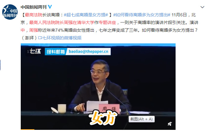 除了离婚率在逐年上涨,离婚提出者中女性比例也在增加。2019年11月6日,最高人民法院院长周强在清华大学专题讲座中指出:2019年超7成离婚是女方提出来的。