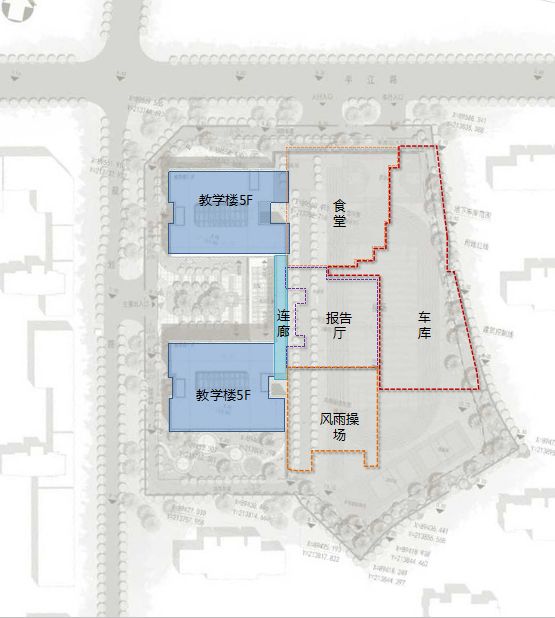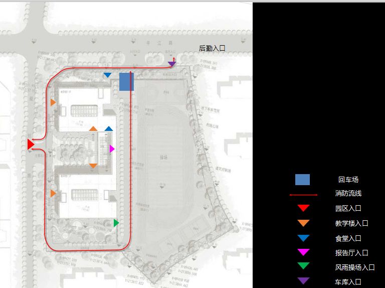 风雨操场、报告厅及食堂出入口独立布置,