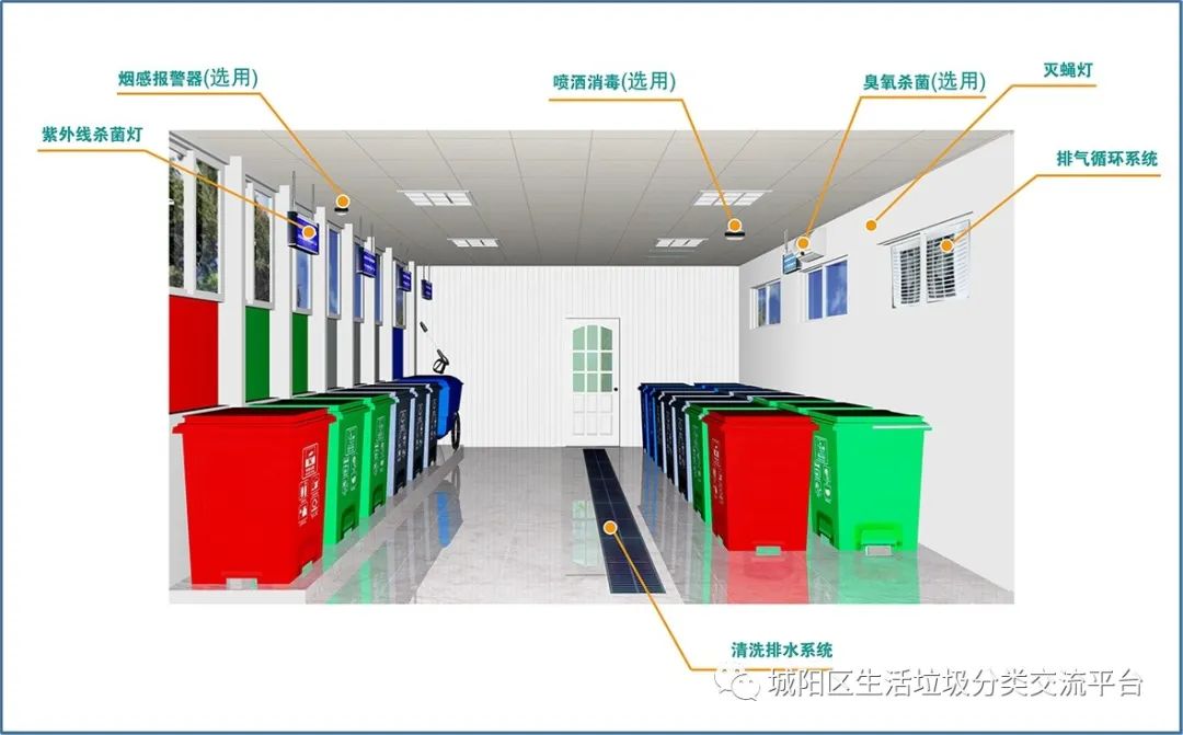 “撤桶并点”作为一种新的垃圾分类管理模式,可以将大量的、分散的垃圾桶撤除,在美化小区环境的同时有利于垃圾分类工作的集中管理。在将桶点进行规划合并后,小区将在合并点建设标准化密闭分类垃圾房,该类垃圾房集垃圾分类称重功能、人脸识别、线上APP、积分兑换、多媒体宣传服务、清洁、防雨、照明、监控等功能于一体,房内配备四分类垃圾桶,并具有杀菌、除虫、除臭功能。