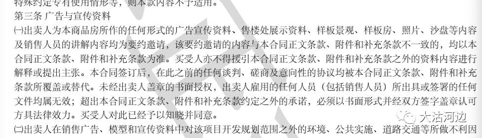 此外,记者还看到,补充条款第三条中,出卖人为商品房所作的任何形式的广告宣传资料、售楼处展示资料、样板景观、样板房、照片、沙盘等内容及销售人员的讲解内容均为要约邀请,该要约邀请与合同不一致的,以合同为准。杨先生认为,这是开发商在变相地为虚假宣传开脱。“像这样不公平的条款很多,所以这合同我没法签字。”