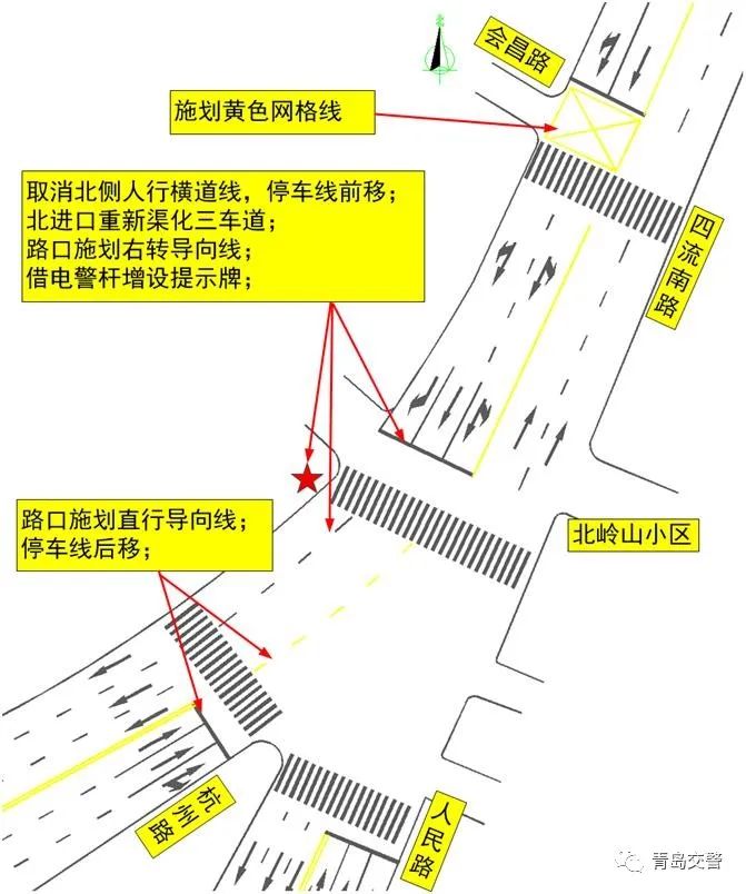 现状四流南路北向南通行空间有限,进口车辆排队长影响北向西右转杭州路车辆通行,为提高路口通行能力,方便市民出行,青岛交警对该路口交通组织进行优化,现方案已实施,具体方案如下: