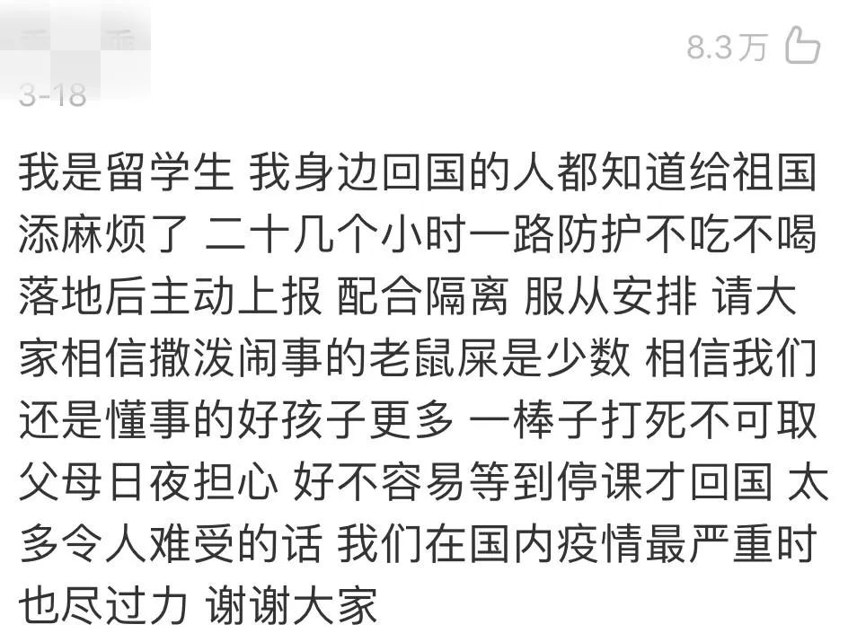 听到这些温暖的话,她悬着的心终于放下:“他们特别好。我能回来就已经是特别幸运了。”来源@晶视频其实,这也是大多数留学生回国旅程的真实写照。有的人一下飞机,看到国内工作人员穿着防护服,就觉得很有安全感。有的人说国内检查很严格、很有秩序,国外一片混乱,真的没法比。还有人说回国的航班里,比起外国人,中国人都很注意防范,主动上报健康信息,不想因自己的疏忽给祖国添堵。