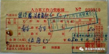 1956年,人力车工作力资收据。(泰安路至齐东路收费五角整)