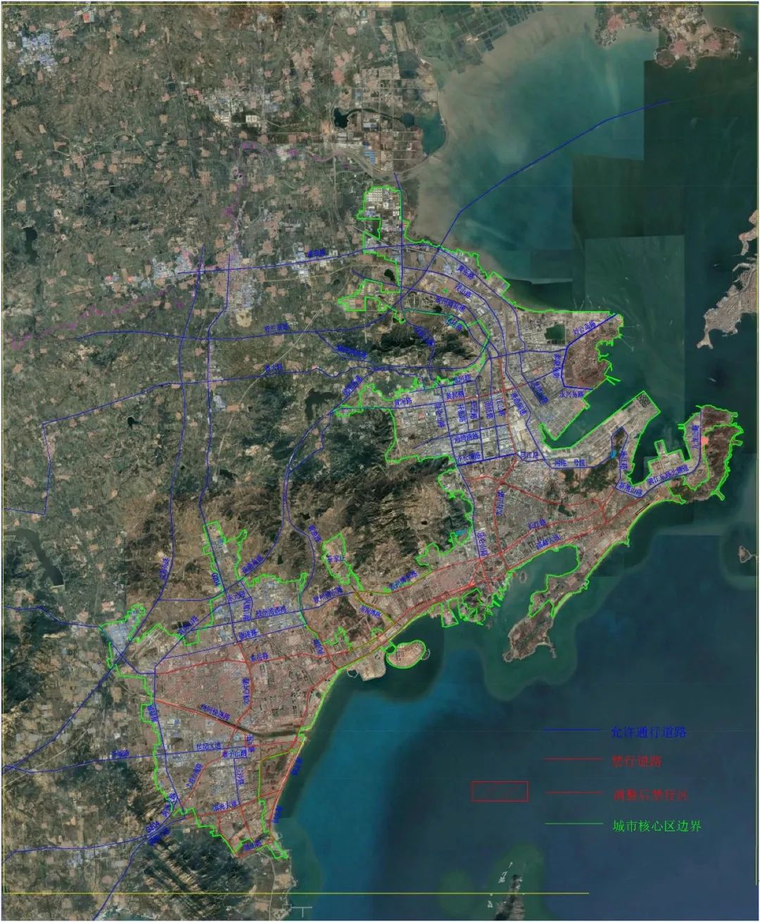 (一)漓江东路北辅道(九龙山路至新港山路,不含该路段),新港山路(不含该路段),长江东路(新港山路至连江路,不含该路段),连江路(不含该路段),汉江路(连江路至长白山路立交,不含该路段),疏港高架桥(长白山路立交至同江路立交,不含该路段),同江路(疏港高架桥至江山路,不含该路段),齐长城路(不含该路段),昆仑山南路(齐长城路至胶州湾东路,不含该路段),胶州湾东路(昆仑山南路至星海滩路,不含星海滩路至两河路路段),两河路(胶州湾东路至临港路,不含该路段),临港路(两河路至双凤山路,不含该路段),双凤山路(临港路至双凤山路与海西路交汇处,不含该路段),海西路(双凤山路与海西路交汇处至风河快速路,不含该路段),风河快速路(海西路至圣元路,含该路段),圣元路(风河快速路至寨子山路,不含世纪大道至寨子山路路段),寨子山路(圣元路至三沙路,不含该路段),三沙路(寨子山路至滨海大道不含该路段),滨海大道(三沙路至山川路,含该路段),山川路(滨海大道至翠岛路,含该路段),翠岛路(山川路至海军路含该路段),以上沿线与东南部海岸线形成的封闭区域。