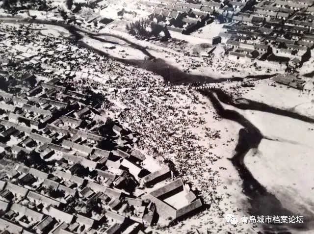 1945年10月10日,这张照片是自西向东拍摄的李村河河口。李村河发源于崂山石门山麓,流经李村并与张村河交汇,最后流入胶州湾,是青岛市区内最大的水系。李村还以李村大集而知名,逢农历的二、七日为集日,沿李村河滩商铺星罗棋布,热闹异常,是青岛历史上重要的商业和文化活动。
