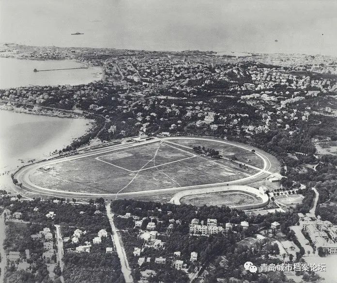 1945年9月29日,自动向西拍摄的汇泉跑马场。青岛太平山南麓曾有个会前村。德占青岛后在会前村修建营地和练兵场,后来练兵场经过扩建也逐渐开展一些竞技性的赛马活动。1923年,成立万国体育会,正式在这里举行赛马会。赛马场也更名为汇泉跑马场。日军占领青岛后,万国体育会解散,赛马活动也一度中断。1945年,日军宣布投降后,青岛的日军投降仪式即在跑马场内举行。如今跑马场已被改建为公共绿地汇泉广场。