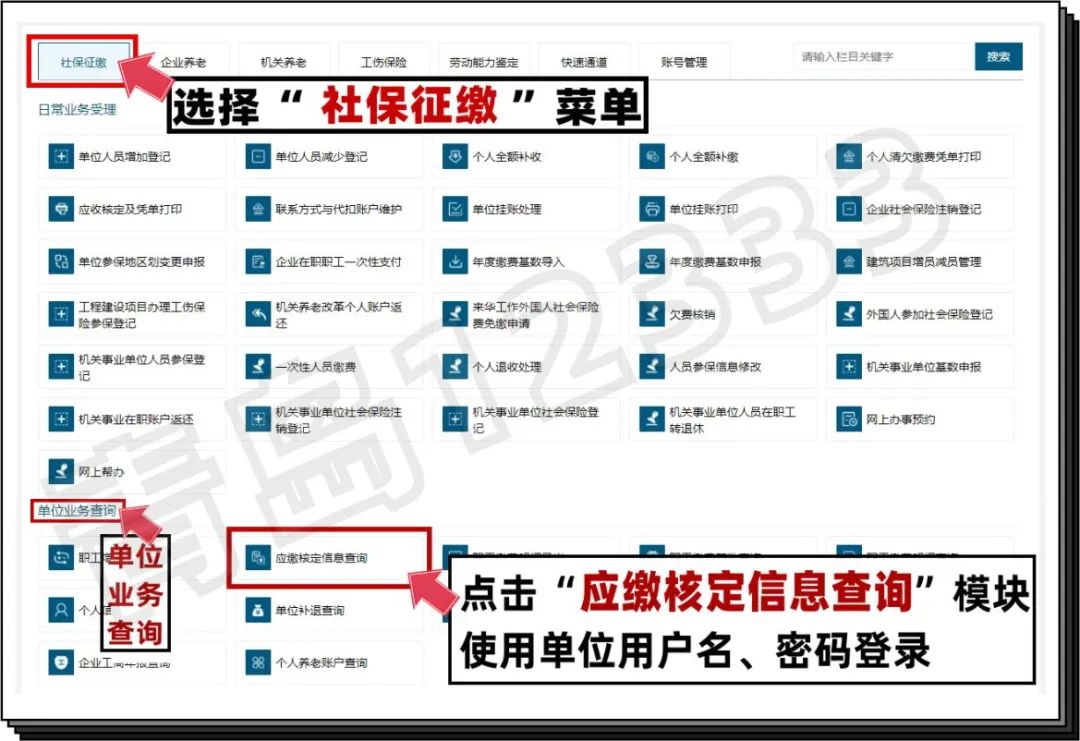 网上办事大厅点击“社保业务”模块在“社保征缴”菜单中“单位业务查询”板块点击“应缴核定信息查询”模块使用单位社保账户