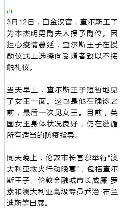 随着新冠肺炎疫情在全球蔓延,继多位国际政要被感染后,英国王储查尔斯王子也在昨天证实被感染。英媒:查尔斯王子新冠病毒检测呈阳性