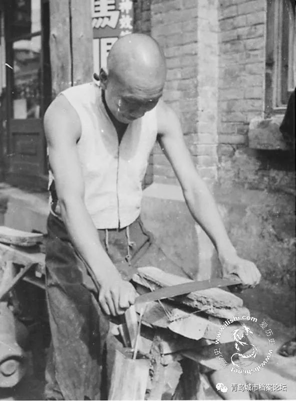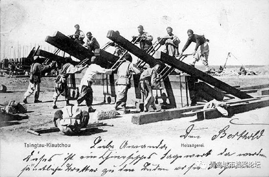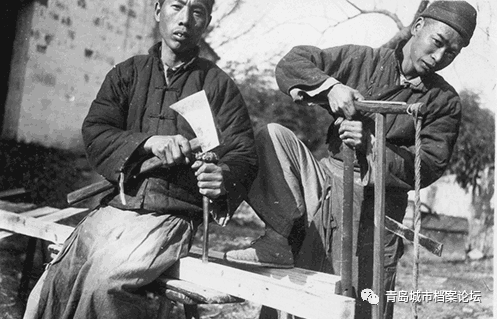 20世纪初,德占青岛时期,中国工人“拉大锯”剖割原木的情形。