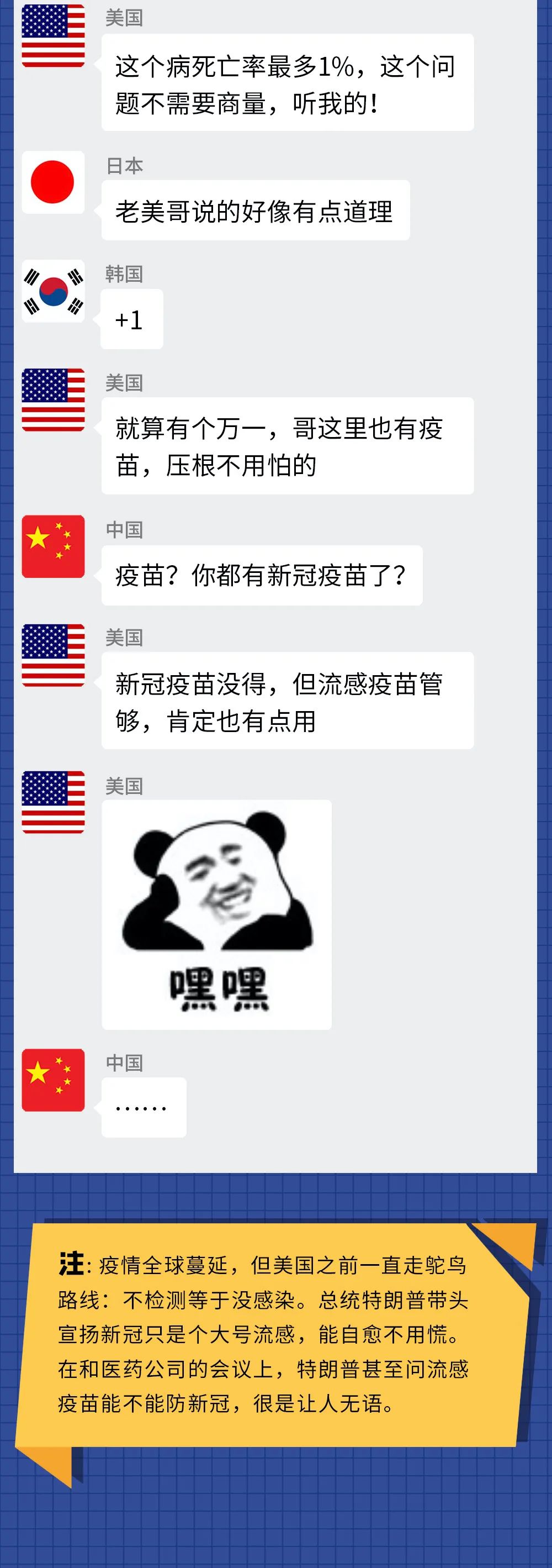 首先是日本和美国的鸵鸟政策,不检测就等于0感染。尤其是美国,一开始说新冠没事,只是个大号流感,死亡率最多不超过1%;后来又说这是个骗局,是政治阴谋;再后来眼见美股熔断,绷不住了,才开始重视疫情。但似乎有点晚了……