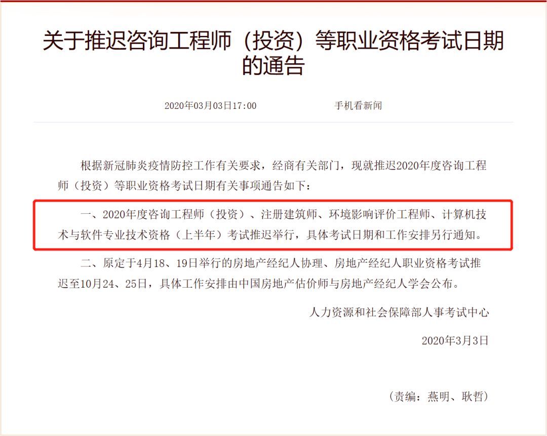 咨询工程师(投资)、注册建筑师、环境影响评价工程师、计算机技术与软件专业技术资格(上半年)考试推迟举行,具体考试日期和工作安排另行通知。