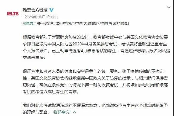 雅思取消4月全国范围考试雅思发布公告:根据教育部对于新冠肺炎防控的安排,教育部考试中心与英国文化教育协会按要求即日起取消中国大陆地区2020年4月各类雅思考试,考试费将全额退还至考生个人报名账户。已主动申请退考4月雅思考试的考生,需通过雅思考试报名网站提交退费申请。保证考生和考务人员的健康和安全是我们的第一要务。鉴于疫情传播的不确定性,英国文化教育协会将继续遵循中国政府关于防疫的指示,与相关部门保持密切沟通,确保在条件允许的情况下第一时间恢复考试,并将增加雅思机考和纸笔考试的考位以满足考生的需求。