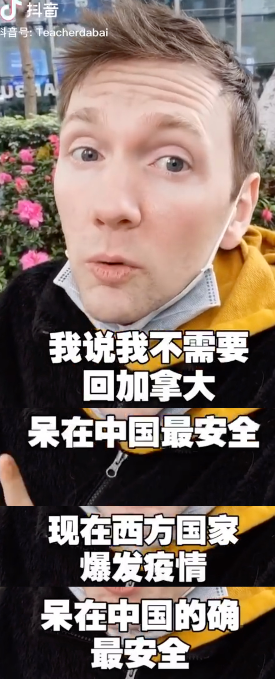 “当时我的父母叫我回家,我说待在中国很安全。现在欧美疫情开始了,我的父母说:果然待在中国是最安全的。”
