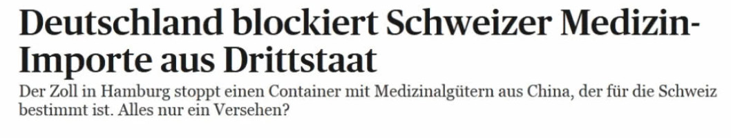 3月8日,一辆载有24万只口罩的卡车驶向瑞士时,在德国境内遭到德国海关阻拦,瑞士大使抱怨称这已经不是第一次出现这样的事情了,瑞士甚至召见德国大使进行抗议。然而仅过了3天,瑞士从中国订购了一批手套物资运往瑞士时,再一次被德国海关扣押。