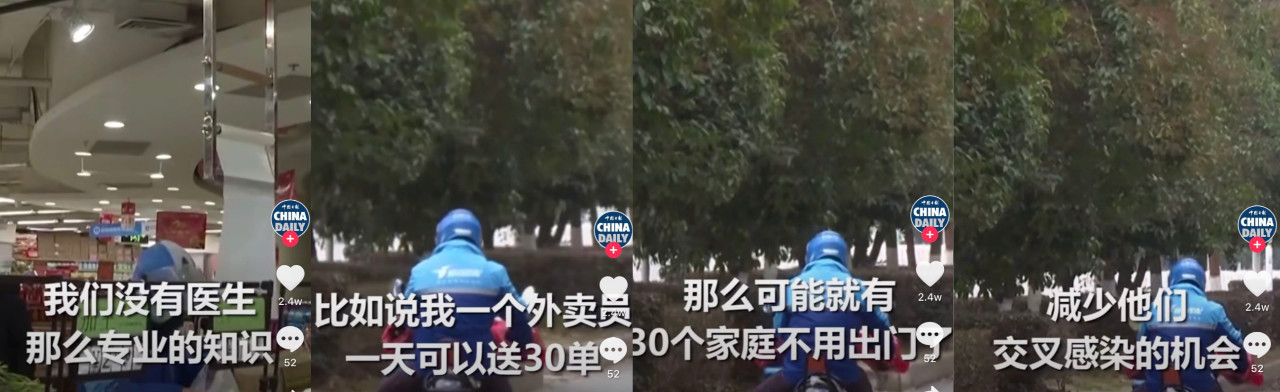 「我们没有医生那么专业的知识。我一个外卖员一天送30单,那么可能30个家庭就不用出门了,就减少了他们交叉感染的机会。」