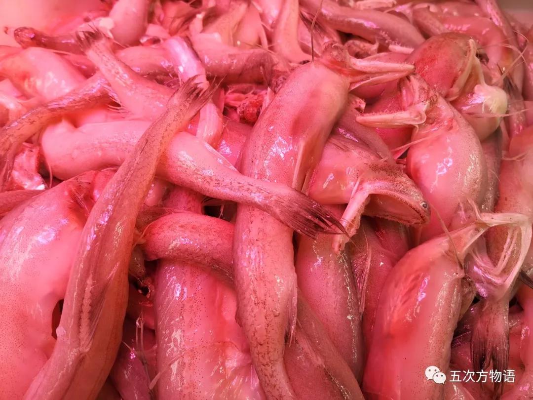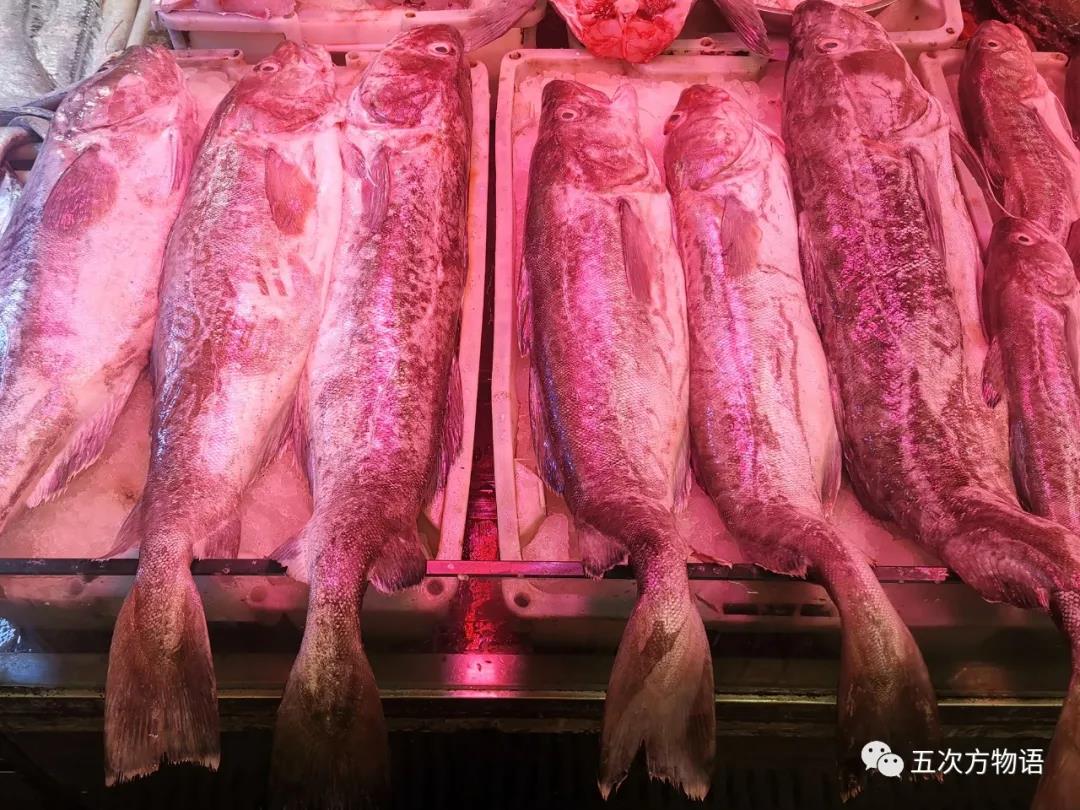 市场的灯光变幻莫测,到“大头腥”这又改暖白了,总之显色性都不行。这鱼我说过很多遍了,太平洋鳕/Gadous macrocephaius,正宗本地鳕鱼,和格陵兰鳕乃是同种至亲。虽然长得埋汰,价格一般,但吃起来还行。