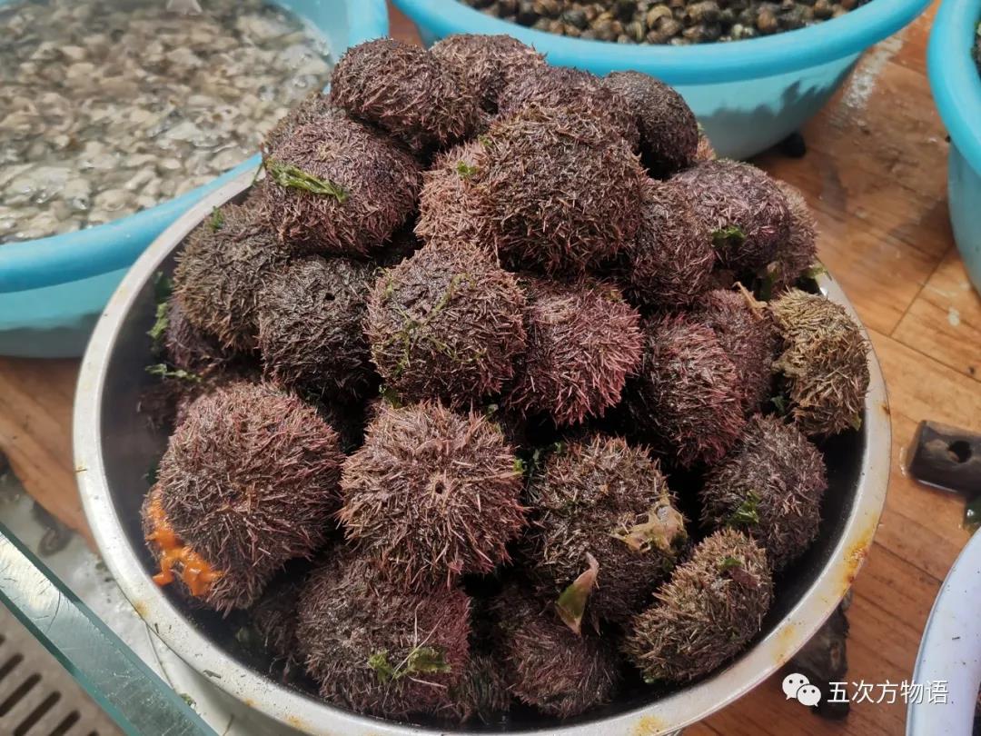 马粪海胆/Hemicentrotus pulcherrimus,北方最常见的食用海胆,身体呈半球形,棘较短,外观上就像一团马粪(我觉得更像驴屎蛋子)。虽然长相狰狞,界面极不友好,但美食不必看脸,主要食用部分是生殖腺,生食最佳。