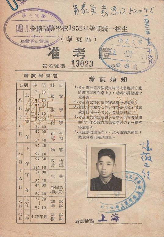 1952年第一次全国高考准考证,上面清晰地记录着高考的时间、科目