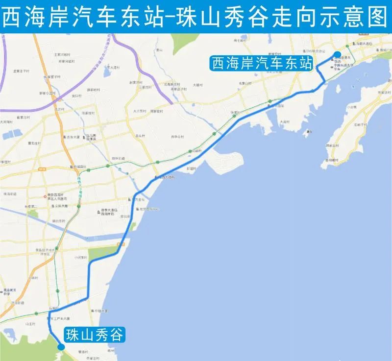 (一)线路走向由西海岸汽车东站(同4路站)发车经长江路、江山路、滨海大道、山川路到达珠山秀谷;回程路线相同。(二)站点设置西海岸汽车东站、石油大学北门、鲁商蓝岸国际(同K1路站)、海上嘉年华、新城吾悦广场、灵山卫公交枢纽站、东方影都、滨海新村(红树林度假世界)、城市阳台、东方海景、海之韵东、中央公园、军民融合学院、石甲、六合社区南、凤凰社区、珠山秀谷,共17站。(三)首末车时间及间隔西海岸汽车东站7:00 -17:00,珠山秀谷8:20-18:20。高峰发车间隔30分钟。根据客流及时调整发车班次,确保乘客安全、顺畅出行。(四)票价票价二元,持琴岛通按规定享优惠。