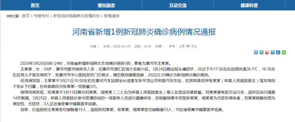 3月29日,河南省卫健委官网通报了这起新增确诊病例。