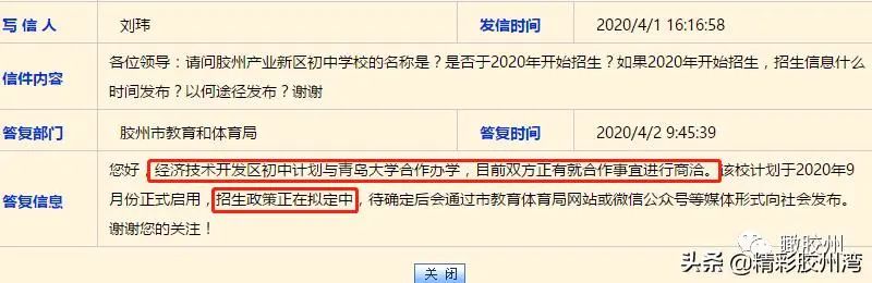 随着上合示范区跨海大桥连接线的落地、城市环境的不断提升,越来越多的市民对学区的期待愈发强烈,有网友问:胶州产业新区初中学校的名称是?是否于2020年开始招生?如果2020年开始招生,招生信息什么时间发布?以何途径发布?