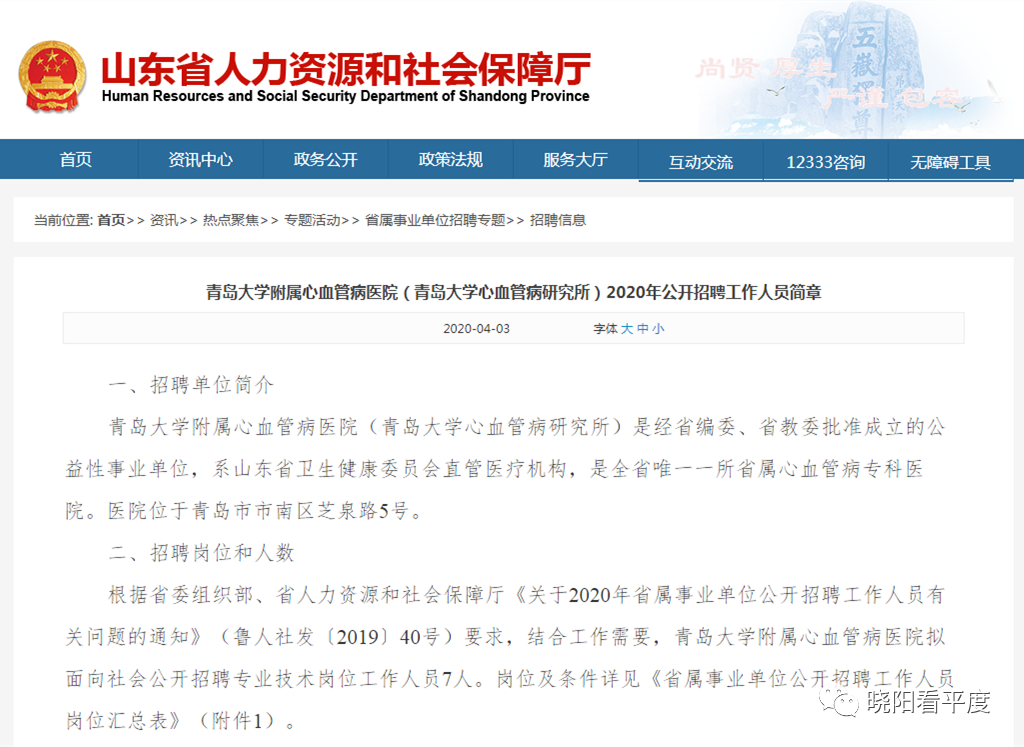 二、招聘岗位和人数 根据省委组织部、省人力资源和社会保障厅《关于2020年省属事业单位公开招聘工作人员有关问题的通知》(鲁人社发〔2019〕40号)要求,结合工作需要,青岛大学附属心血管病医院拟面向社会公开招聘专业技术岗位工作人员7人。岗位及条件详见《省属事业单位公开招聘工作人员岗位汇总表》。