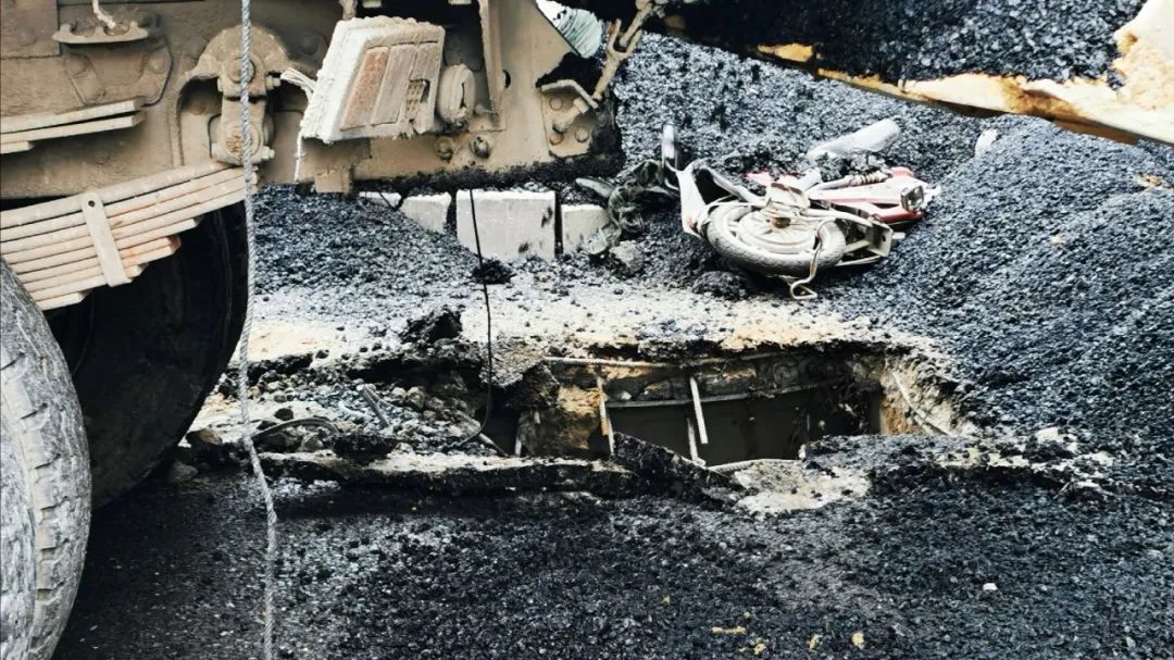现场多名施工工人见状,赶紧跑上前齐大伙子一起动手,用铁锹将沥青挖开,将被埋老人扒了出来,