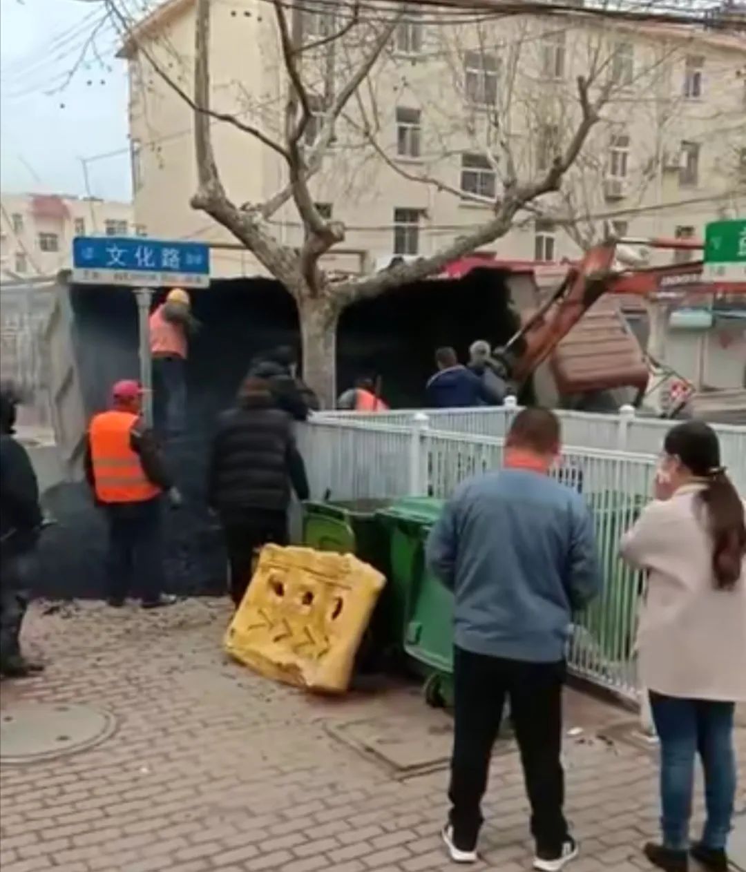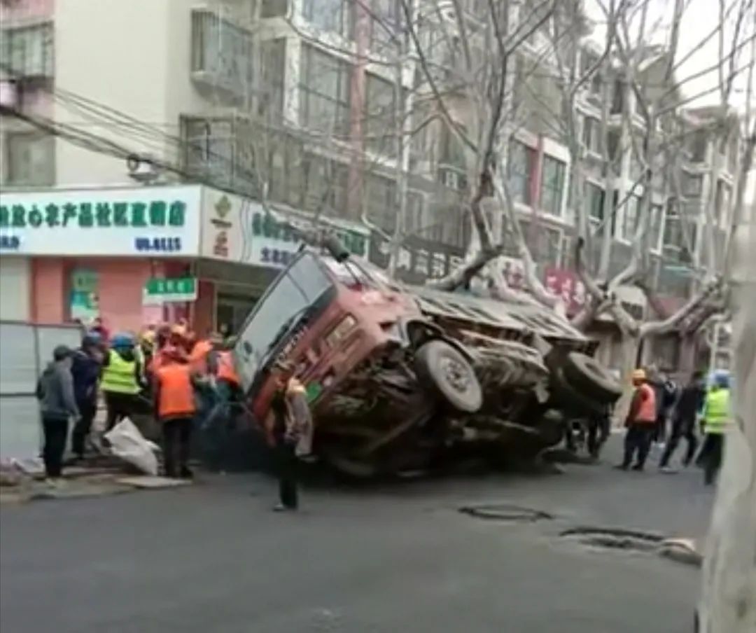 4月10日上午8时左右,黄岛区(老胶南)益民巷和文化路交界处,此地正在进行老城区道路翻新市政工程,一辆满载沥青准备铺路的大货车右侧车轮突然压到一处古力盖上,古力盖塌陷,大货车发生侧翻,满车沥青倾泻而出,瞬间将一个60岁左右的男子跟一辆电动车埋在底下,幸好路边粗壮的法桐树干挡了一下车头,让货车没有完全翻倒,否则车斗如果压下去,后果不堪设想。