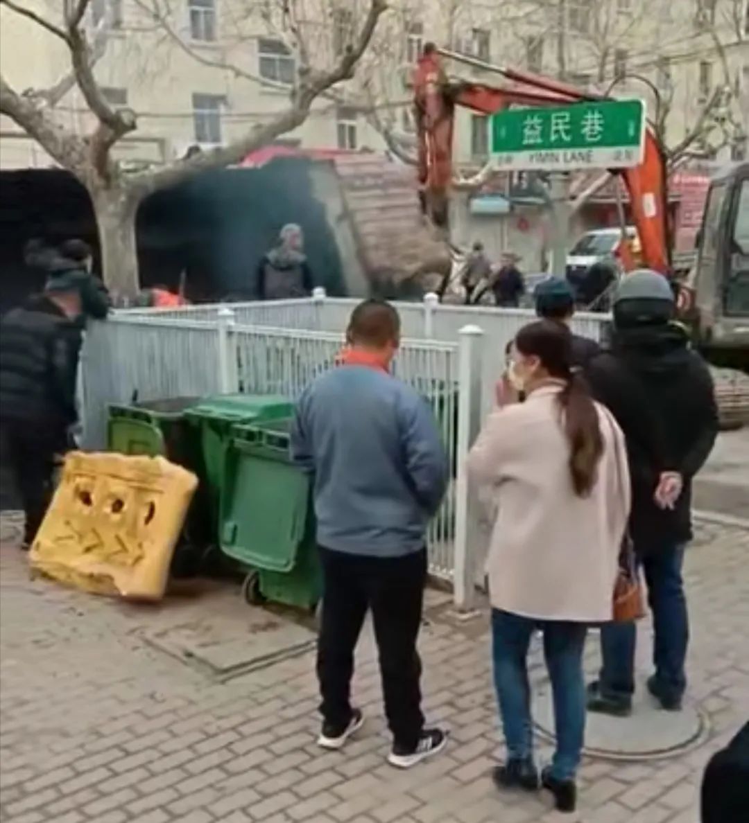事发后,施工方调来一辆大挖掘机,将侧翻的大货车正了过来,然后将被埋的电动自行车也挖了出来,据附近门头一位大姐介绍,事发时她正好站在门口,看到了事情整个经过,那个被压的老人就是在那里干活的工人,被挖出后不知道是吓得还是昏迷了,已经说不出话了。