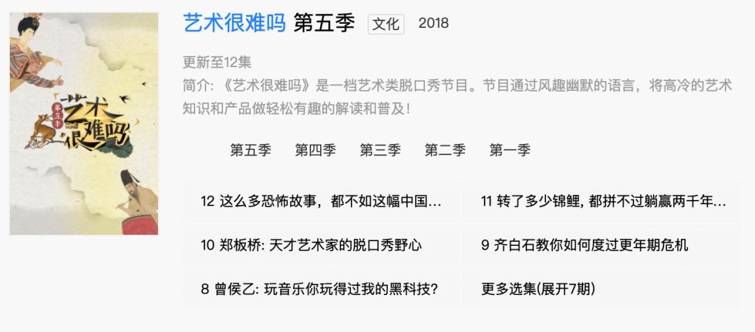 △国内第一档艺术脱口秀《艺术很难吗》系列这档节目用轻松的大白话,接地气的视频,讲晦涩难懂的艺术故事。每集不到十分钟,却让人涨知识,有收获,看完意犹未尽!随手放几个视频标题,都让人忍不住想点开——1.梵高:人穷就不该去画画2.齐白石:被艺术耽误的带货王3.用心理学揪出《最后的晚餐》里的犹大4.《清明上河图》里未解的千年悬案5.这倒霉皇帝创下了性冷淡风……