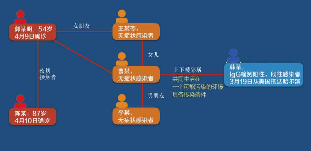 由于确诊者郭某明、无症状感染者王某苓不配合流调工作,给追溯传染源、查清密切接触者带来极大困难,哈尔滨市公安机关已第一时间介入并开展立案调查。现经哈尔滨市疾控中心与公安侦查机关联手调查,王某苓的女儿曹某可能接触境外入哈人员所污染的环境致病,进而导致家庭成员集聚感染。曹某与韩某为楼上楼下邻居,韩某于3月19日从美国抵达哈尔滨,居家隔离观察。期间,双方共同居住生活在此。韩某3月31日核酸检测为阴性,抗体检测IgM、IgG均为阴性,4月3日核酸检测为阴性,遂解除居家隔离。郭某明发病确诊后,卫健委进行了溯源分析时发现,曹某与韩某存在感染可能,所以,卫健委又于4月10日和11日,再次对韩某进行了两次抗体检测,其中,IgM均为阴性,IgG均为阳性,为新冠肺炎既往感染者。经现场模拟调查分析,韩某与曹某共同生活在一个可能污染的环境,具备传染条件。截至11日下午3时,已排查追踪到密切接触者456人,其中,集中隔离医学观察155人,居家隔离医学观察301人。同时,对涉及到的住宅小区单元、有关活动场所也采取了封闭管控、消毒等措施。黑龙江、广东连续出现本土病例