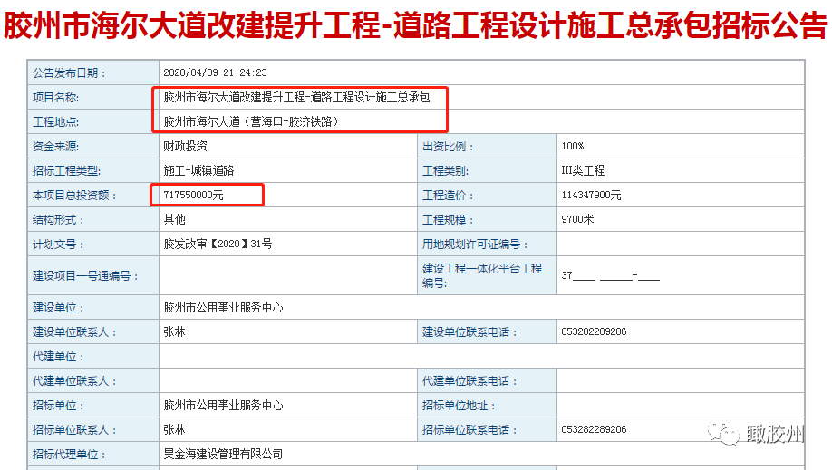 4月9日,胶州市海尔大道改建提升工程-道路工程设计施工总承包开标,该项目预计总投资为7.17亿,全长约9700米的海尔大道进行整体改建提升。