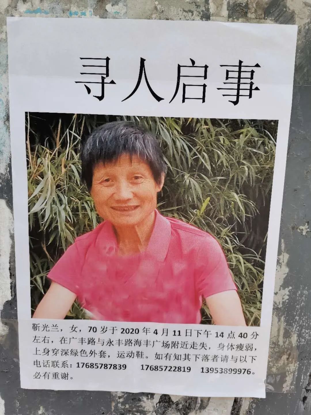 寻找妈妈:靳光兰,女,70岁,住在小水清沟社区,于2020年4月11日下午14:30左右,在广丰路与永丰路海丰广场附近走失。身体瘦弱,走路一瘸一拐的,患有间歇性的阿尔茨海默症。走失时,上身穿深绿色外套,穿运动鞋,如果有哪位见到我妈,请联系我:13687694366。