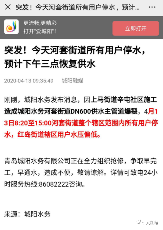 刚刚,城阳水务发布消息,因上马街道辛屯社区施工造成城阳水务河套街道DN600供水主管道爆裂,4月13日8:20至15:00河套街道整个辖区范围内所有用户停水,红岛街道辖区用户水压偏低。青岛城阳水务有限公司正在全力组织抢修,争取早完工,早通水,造成不便,敬请谅解。详情可致电24小时服务热线:86082222咨询。