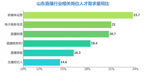因直播行业的迅猛发展,不仅主播岗位人才缺口巨大,其他相关岗位人才需求量也在快速增长。数据显示,新媒体运营、电子商务专员、教师、市场策划等岗位需求量也在同比增长,其中新媒体运营需求量增长23.7%位居第一,电子商务专员以21%排名第二,直播助理需求量增长了20.7%。