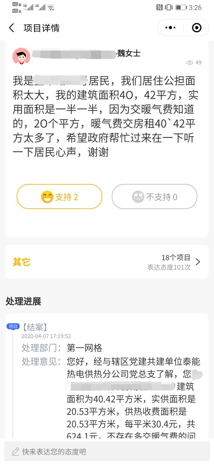 日前,湖岛街道瑞安路社区第一网格通过“党群e家”小程序收到金华路46号10号楼居民魏女士的议题:“我是金华路46号居民,我们居住公摊面积太大,暖气费太多,希望来调查一下,听下居民心声,谢谢”。该议题一发,受到51人关注。收到居民的问题反馈以后,网格社区第一时间“吹哨”到街道,为切实解决居民的操心事、烦心事,街道联系居民详细了解事情原委,倾听居民的诉求。