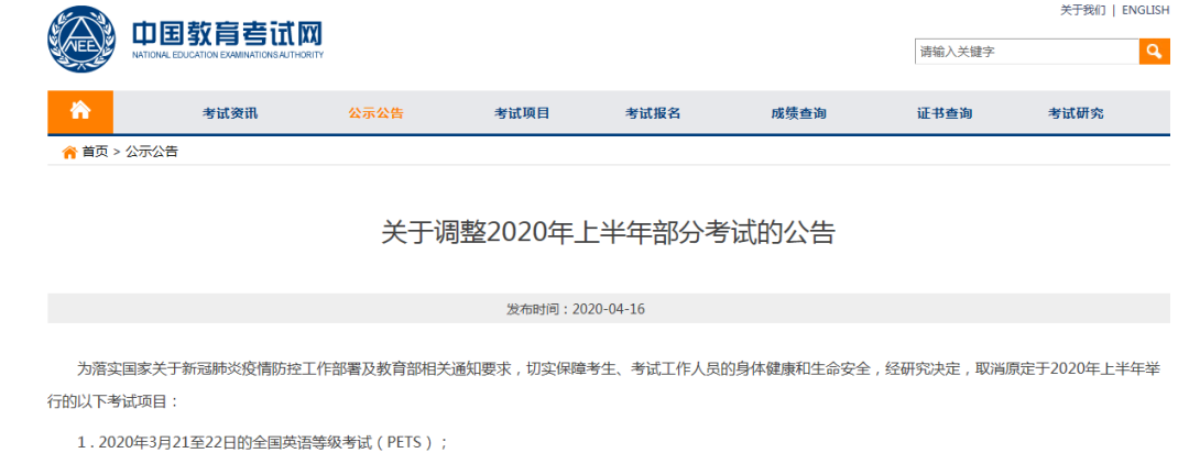 1. 2020年3月21至22日的全国英语等级考试(PETS); 2. 2020年3月21至24日,5月30日至6月2日的全国计算机应用水平考试(NIT); 3. 2020年3月28至30日的全国计算机等级考试(NCRE); 4. 2020年5月16至17日的全国外语水平考试(WSK); 5. 2020年5月23至24日的书画等级考试(CCPT); 6. 2020年5月23至24日的全国大学英语四六级口语考试(CET-SET)。 全国大学英语四六级笔试(CET)考试时间将视情况另行通知。 PETS和NCRE已报名考生的考试费将全额退还,具体情况请考生密切关注报名网站有关信息。 由此给各位考生带来的不便敬请理解。